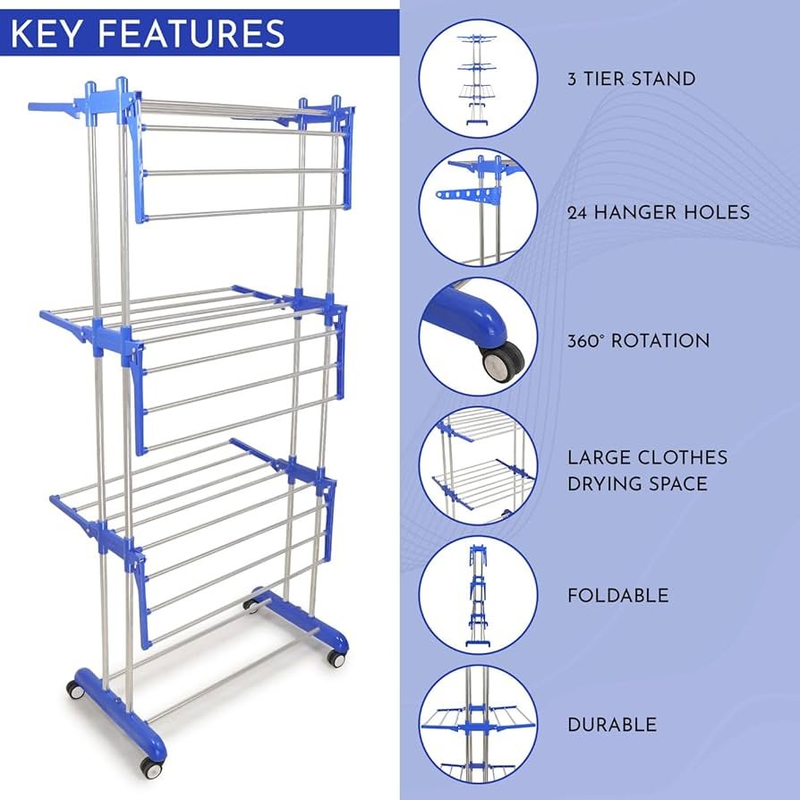 It is typically lightweight enough to be moved easily between rooms or different drying locations. Some models include wheels or castors for even easier mobility, often with a locking mechanism for stability.